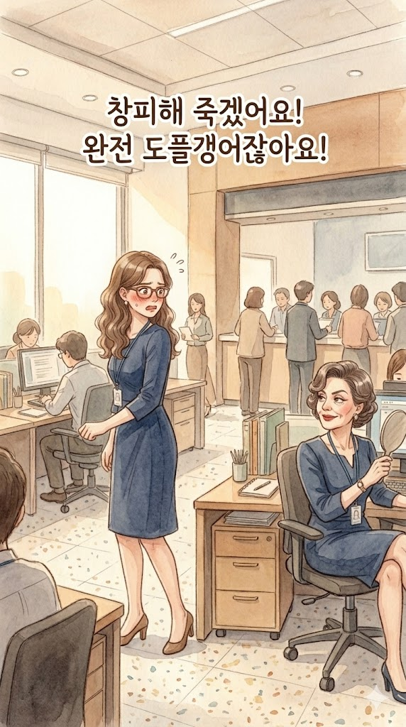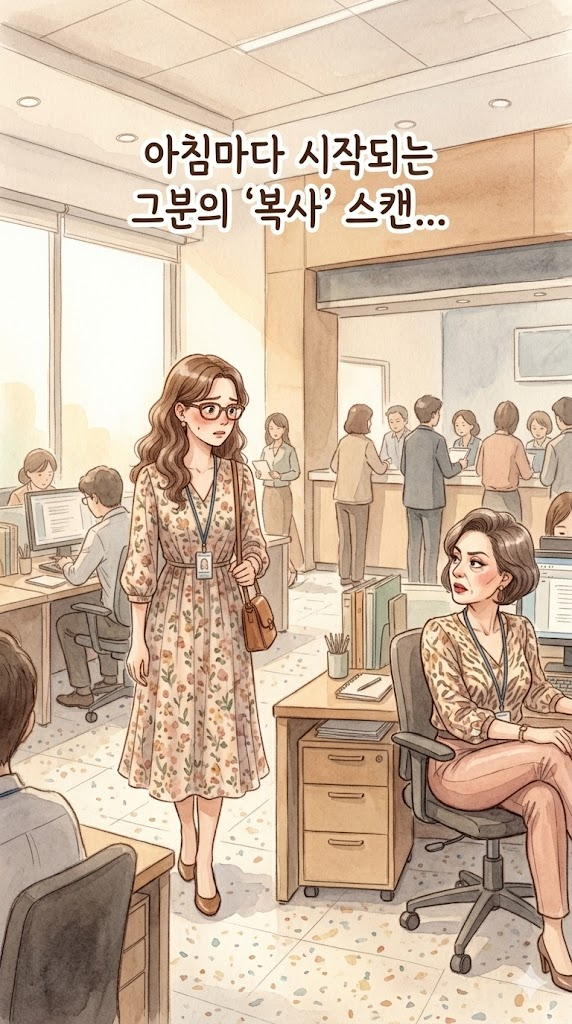 아니, 언니! 아침에 출근하자마자 이 50대 여직원이 동생을 머리 끝부터 발끝까지 아주 뚫어져라 스캔을 한대요. 그러고는 며칠 뒤에 보면, 글쎄 동생이 입었던 옷이랑 디자인도 비슷하고 색상도 똑같은 걸 버젓이 입고 나타난다는 거예요! 똑같은 건 양심상 못 사고 '비스므리'한 걸로요. 매일 아침 "오늘은 또 뭘 따라 하려나" 무서워서 출근하겠어요?