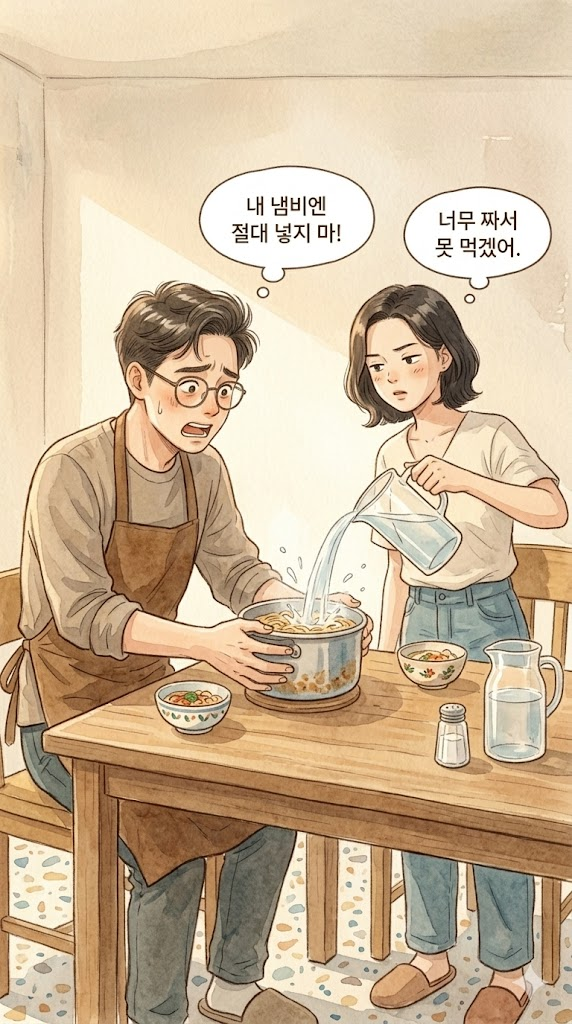 다 끓인 후 각자 그릇에 덜었는데 상대방이 면이 짜다며 물을 더 넣겠다고 하더군요. 그래서 저는 분명히 본인 그릇에만 넣고 냄비 전체에는 넣지 말라고 두 번이나 강조해서 말했습니다. 하지만 제 말이 끝나기가 무섭게 물병을 들더니 냄비에 물을 콸콸 부어버리는 게 아니겠어요?