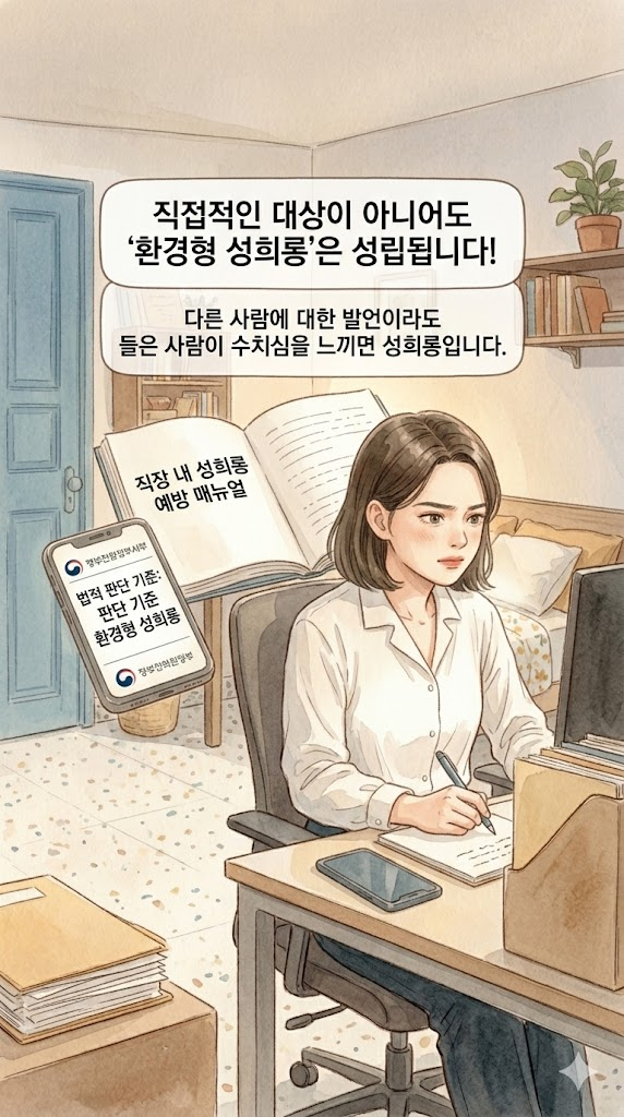 주변 친구들이 "너한테 직접 하는 소리 아니면 처벌 안 돼"라고 했다는데, 아유~ 그건 정말 모르고 하는 소리예요! 우리나라 법이 그렇게 허술하지 않거든요. 특정인을 지칭하지 않아도 '성적 굴욕감'이나 '혐오감'을 주는 환경을 만들면 그게 바로 '환경형 성희롱'이라고요! 이미 전임 여직원들이 그것 때문에 줄줄이 퇴사했다는 건 빼도 박도 못하는 증거 아니겠어요?